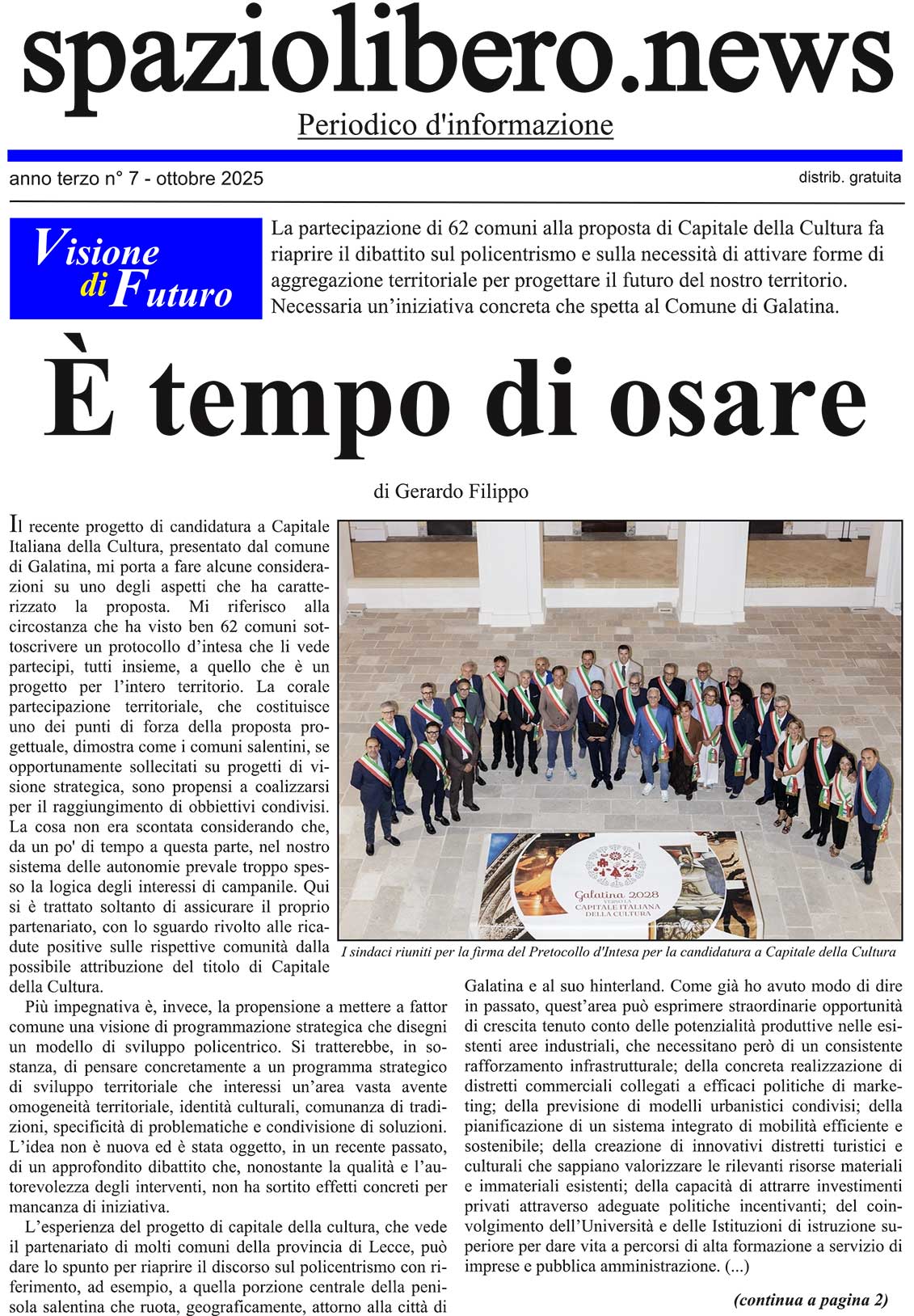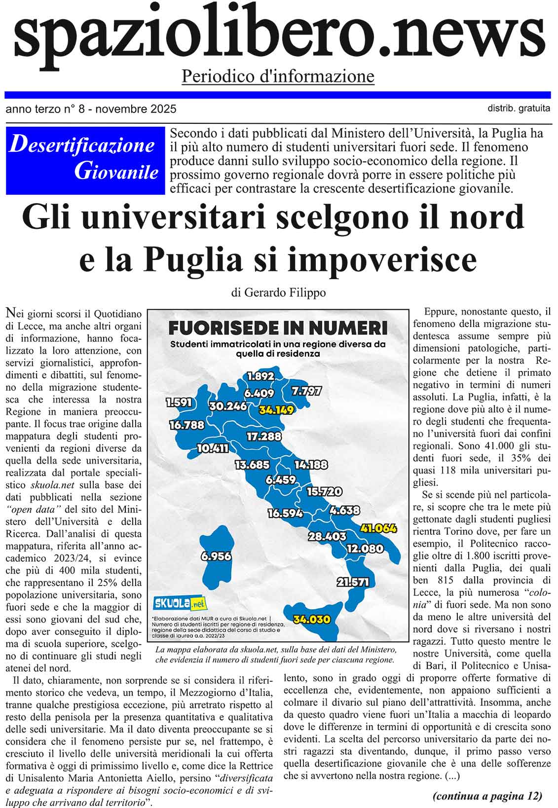 © 2025 spaziolibero.news Periodico d'informazione --- Testata giornalistica iscritta al n. 10/2022 del Registro Stampa del Tribunale di Lecce --- Direttore responsabile: Daniele G. Masciullo --- Direttore editoriale: Gerardo Filippo