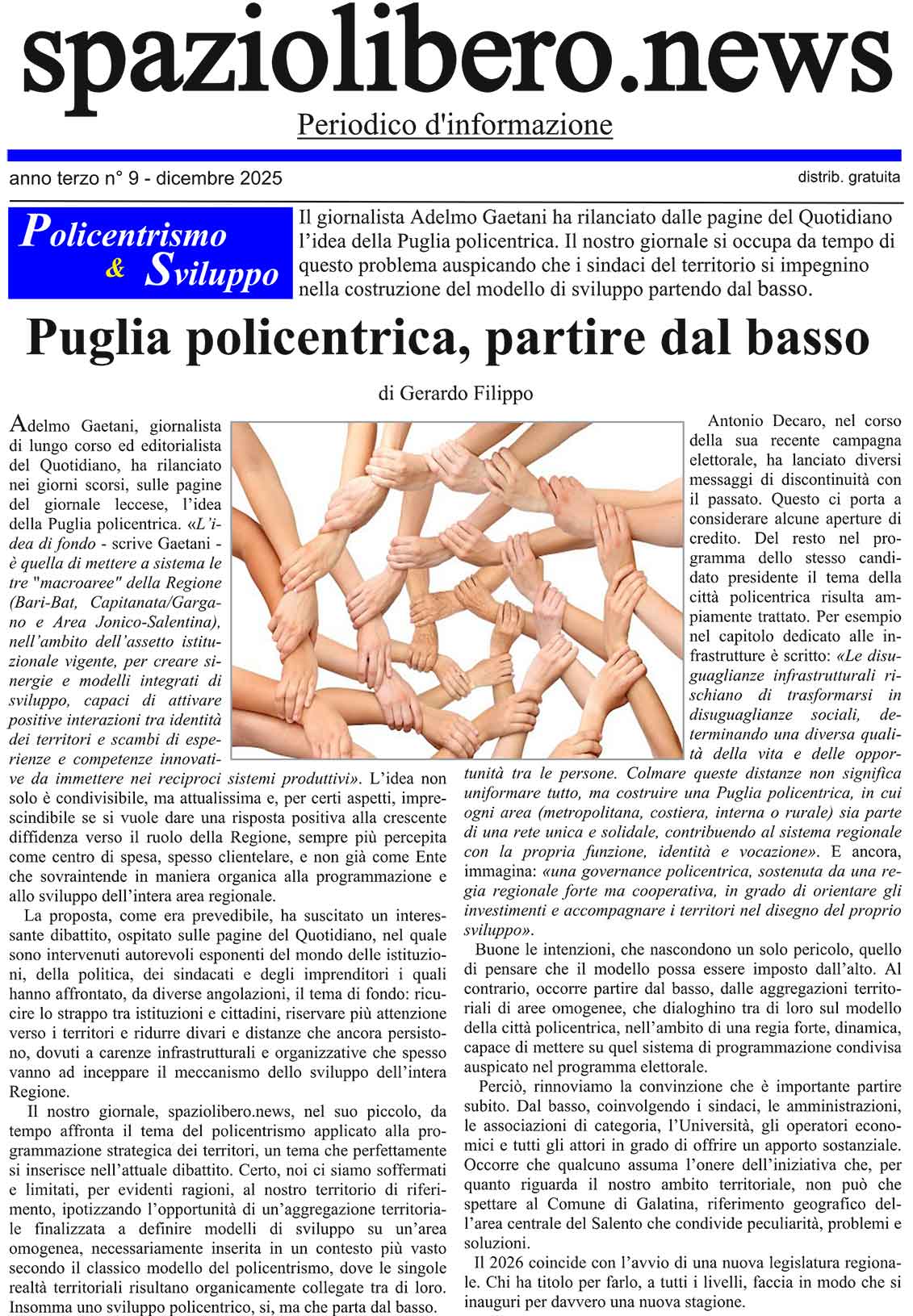 © 2025-2026 spaziolibero.news Periodico d'informazione --- Testata giornalistica iscritta al n. 10/2022 del Registro Stampa del Tribunale di Lecce --- Direttore responsabile: Daniele G. Masciullo --- Direttore editoriale: Gerardo Filippo